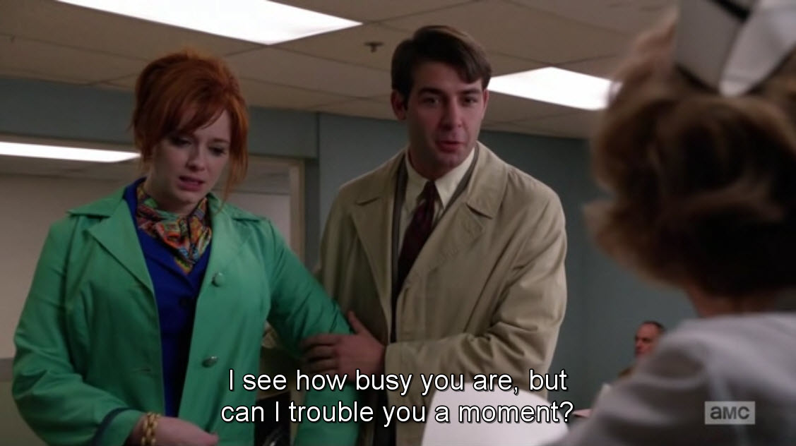 - ועוד פגי, כי קצת הזנחנו אותה: כשג'ואן שואלת אותה מה שלום הבחור שלה, היא אומרת: "קנינו יחד דירה לגור בה", ומייד מתקנת: "קנינו דירה לגור בה יחד". עוד רמזים לשבר הצפוי בינה לבין אייב או שהעניין מספיק ברור?