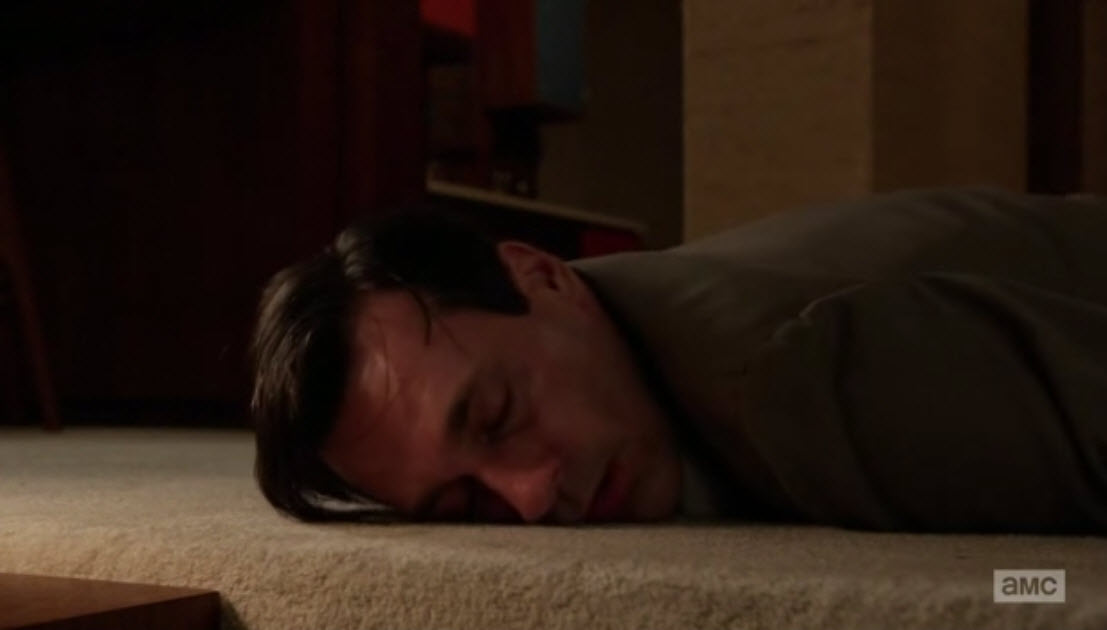 שם הפרק הוא The Crash, התרסקות. הוא מתחיל בהתרסקות של המכונית של קן. מכונית נוספת – שברולט – נראית כמתרסקת לתוך החברה ומאיימת לרסק גם את האיחוד הטרי. אבל ההתרסקות הגדולה מכולם היא כמובן של דון, שמתרסק בשלוש חזיתות: בבית, בעבודה, ועם המאהבת. התרסקות היא גם מה שקורה לך אחרי שהסטלה נגמרת. וזה בדיוק מה שקורה לדון על פרקט הדירה שלו.