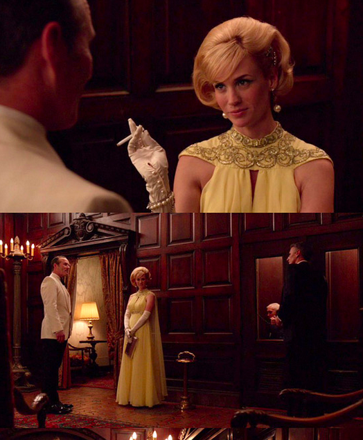 קודם לכן בארוחת ערב עם הארי ופוליטיקאים אחרים, היא לובשת שמלת נשף באורך הרצפה בצהוב המתיישב עם הבלונד ההוליוודי והלבן החגיגי, כולל חזה מרופד וכפפות אופרה – שמלה שג'קי קנדי הייתה שמחה ללבוש בדינר רשמי בבית הלבן (מה גם שהיו לה ככפות כאלו). בזמן שהיא ממתינה להנרי שמדבר בטלפון בתא סמוך, אורח חצוף נעמד מולה ומצהיר שהוא היה רוצה לבלות איתה את הלילה.. היא לא מאמינה ואומרת לו ש"יש לה שלושה ילדים". אבל התקרית חיזקה את ביטחונה וללא ספק הייתה, בין היתר, אחת הסיבות שגרמו לה לפתות את דון בטוויסט מהטובים במד מן.