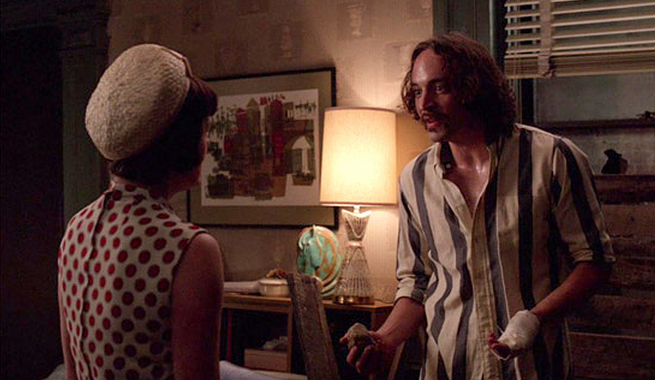 מאוחר יותר בדירתה, פגי נראית כמו הפרסומאית הניו יורקית הצעירה שהיא. שמלת המיני חושפת הכתפיים וצמודת המותניים על שני גווניה הנעימים – קרמל ולבן – מחמיאה לה, אך גם מחזקת את התחושה שהסביבה פה לא נעימה ולא נכונה יותר עבורה. דירה צפופה בהארלם מוכת הפשע והעוני, עם בויפרנד בעל השקפות פוליטיות קיצוניות שלא מסכים איתה על כלום (ובנוסף גם לובש פסים קונטרסטיים לנקודות שלה). הגיע הזמן לשינוי. אין ספק שמדובר ב"שיט הול", שכדאי להיפטר ממנו, כמו שהיא אומרת.